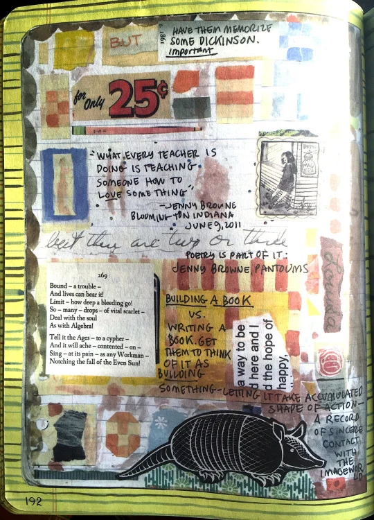 In my quest to break free from the conventional classroom, I talked to people at NUNM, made friends with the Dean of Faculty Development and Curriculum Design, but I found no real answers. It wasn’t until one day with some unstructured down time (research is now showing how important open and unstructured time is to support the creative process), I wandered into Powell’s Books. I was looking at books on writing. And I saw a spine that looked like the spine of a composition notebook. The title, Syllabus appeared handwritten in marker. I was plagued by having to write syllabi because of how rigid and confining they felt. So, I pulled this book off the shelf and saw these wild drawings on the cover, I opened to the first pages and they were a collage-like blend of drawings and handwritten notes, amazing questions with no answers offered, random clippings from old magazines and newspapers, bits of poetry, Rumi and Dickinson. I was hooked.