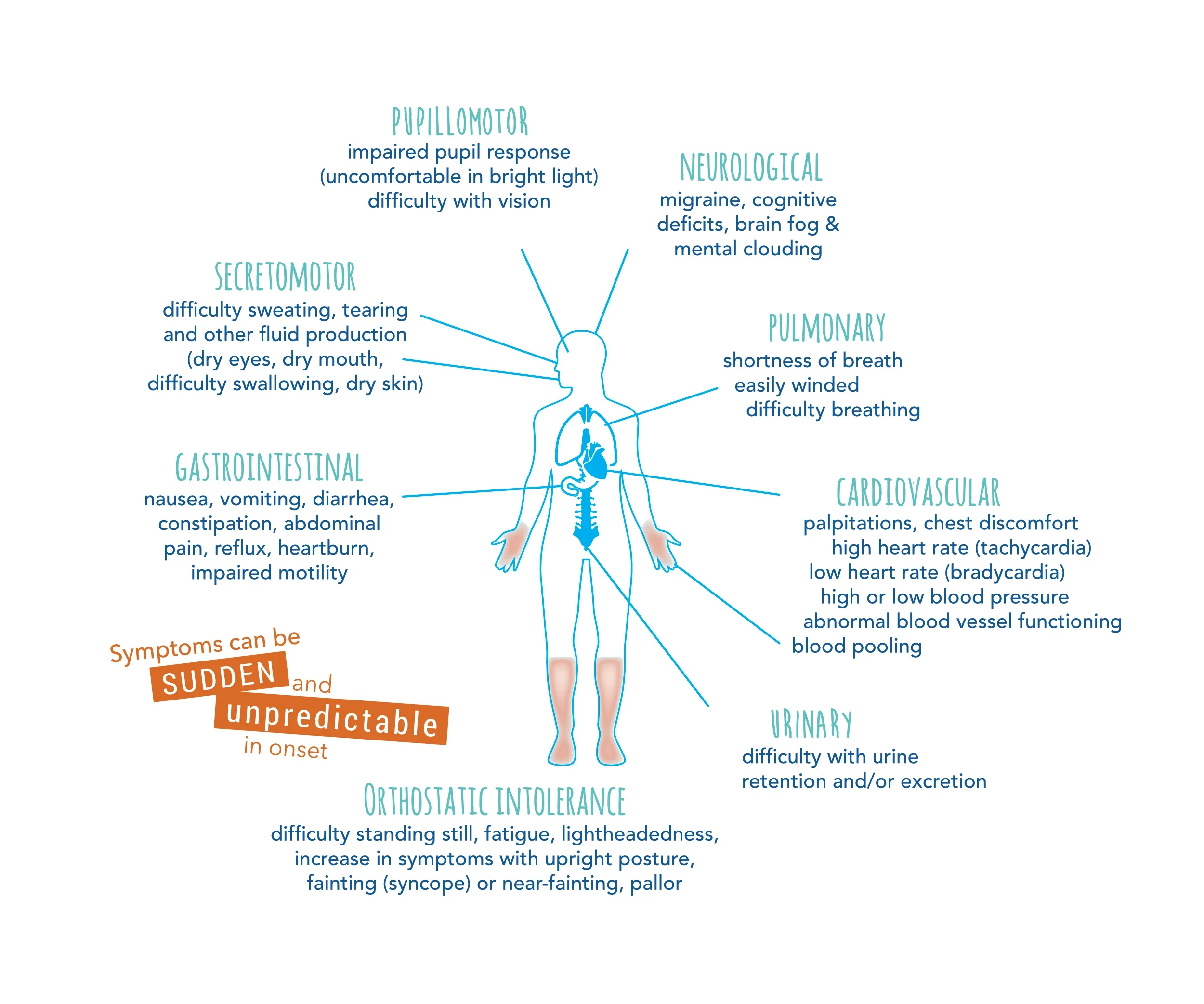 Because each body is unique, the specific presentation of autonomic nervous system issues is entirely unique to the individual. The Dysautonomia Project offers a good grouping of systems and examples of symptoms: