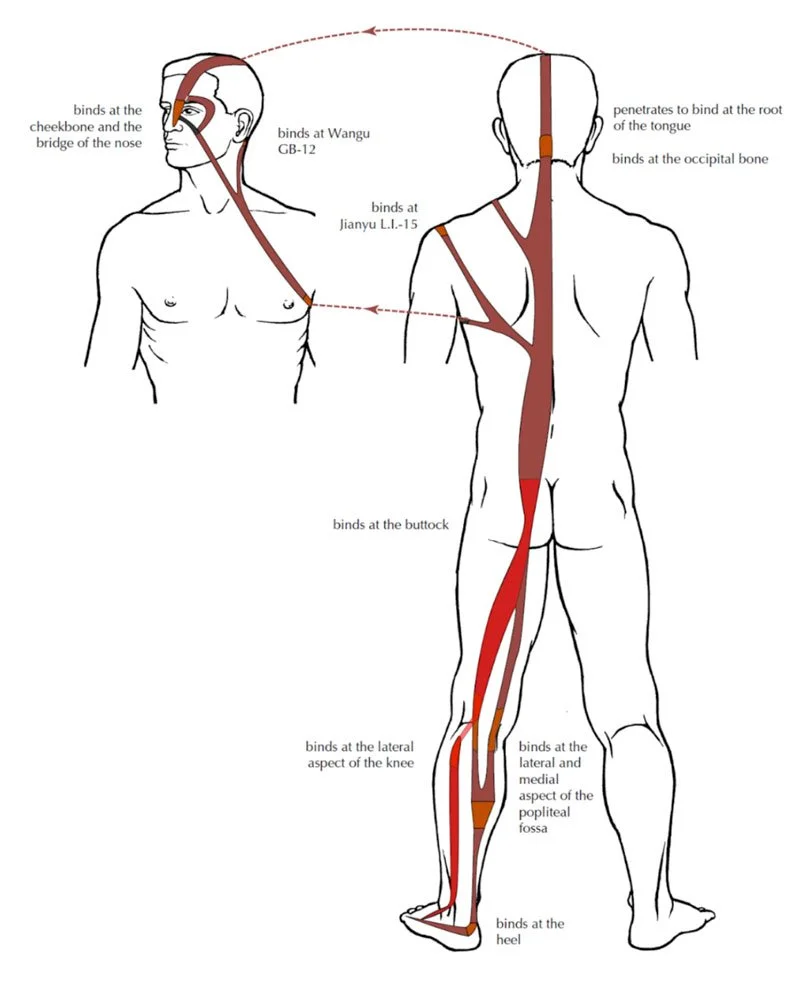 It’s interesting to compare the Grey’s image of the lat with this highly schematic rendering of the bladder sinew channel from Chinese medical anatomy. Sinew channels are fascial channels related to the main meridian in Chinese medicine. They are an aspect of the Chinese medical anatomy framework. These pathways can give us insights into myofascial and energetic relationships in the body. Here we can see a link going from the main pathway up the back (which correlates with the posterior myofascial pathway) to the scapula very similar to how the lat connects.