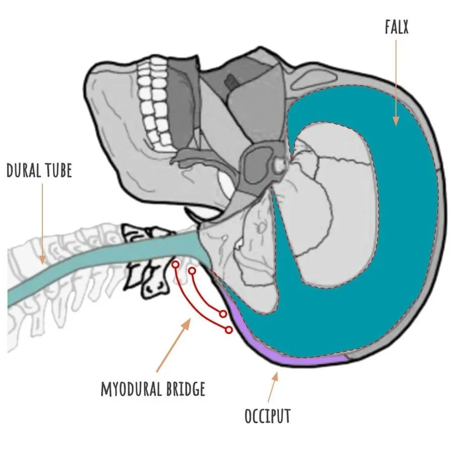 The myodural bridge is where myofascia of two of the sub occipital muscles, the rectus capitis posterior major and minor, have fascial connection with the dural tube–the membrane surrounding the spinal cord. This means that good myofascial work at the sub occipitals could also be considered fairly direct work on the craniosacral system.